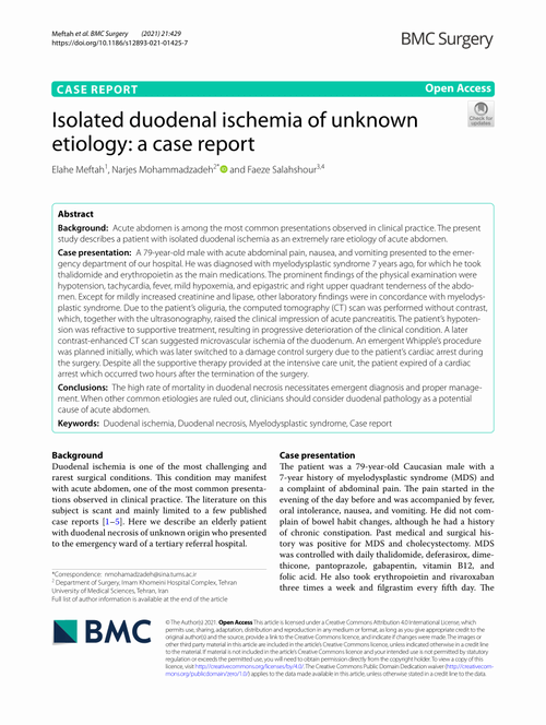 Case presentation: A 79-year-old male with acute abdominal pain, nausea, and vomiting presented to the emergency department of our hospital. He was diagnosed with myelodysplastic syndrome 7 years ago, for which he took thalidomide and erythropoietin as the main medications. The prominent findings of the physical examination were hypotension, tachycardia, fever, mild hypoxemia, and epigastric and right upper quadrant tenderness of the abdomen. Except for mildly increased creatinine and lipase, other laboratory findings were in concordance with myelodysplastic syndrome. Due to the patient's oliguria, the computed tomography (CT) scan was performed without contrast, which, together with the ultrasonography, raised the clinical impression of acute pancreatitis. The patient's hypotension was refractive to supportive treatment, resulting in progressive deterioration of the clinical condition. A later contrast-enhanced CT scan suggested microvascular ischemia of the duodenum. An emergent Whipple's procedure was planned initially, which was later switched to a damage control surgery due to the patient's cardiac arrest during the surgery. Despite all the supportive therapy provided at the intensive care unit, the patient expired of a cardiac arrest which occurred two hours after the termination of the surgery.
